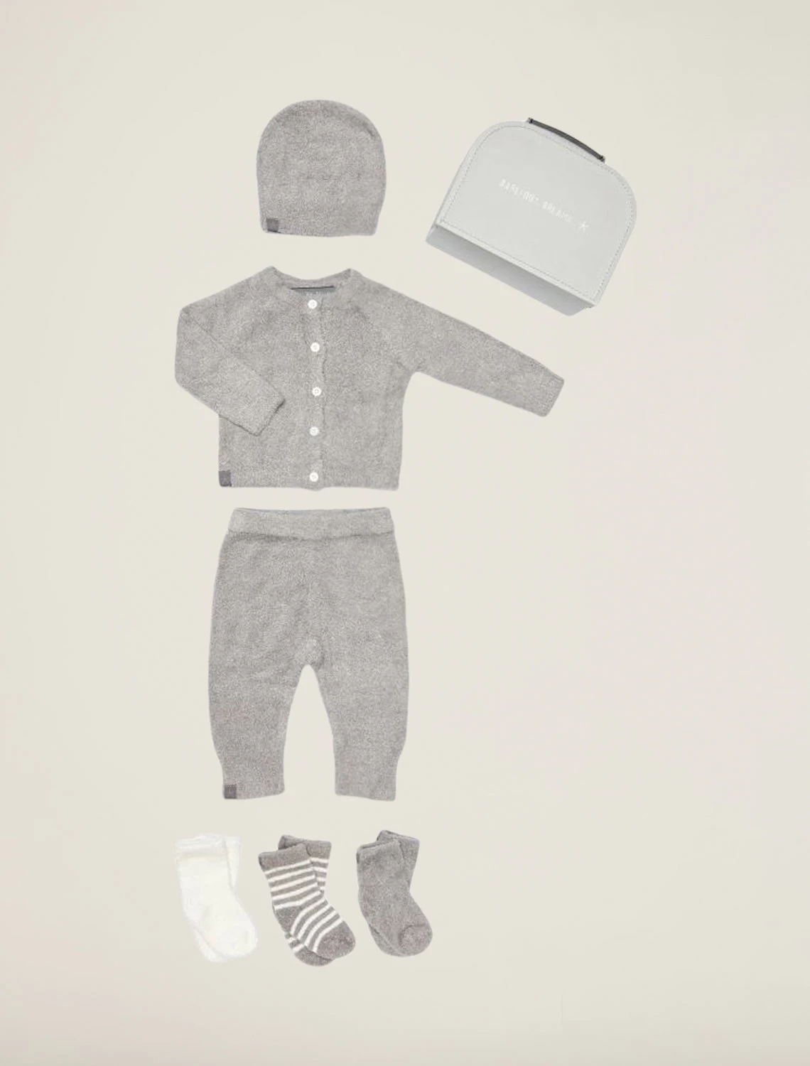 Coming home from the hospital just got sweeter with our Heirloom Newborn Set. This is every newborn’s must have when it comes to being enveloped in super soft, luxurious coziness for their first trip home. Each suitcase ensemble includes a CozyChic Lite cardigan, pull on pant, beanie and three pairs of socks.The suitcase doubles as the perfect keepsake box that details important info; Name, Date, Time, Place, Height, Weight and Born to.