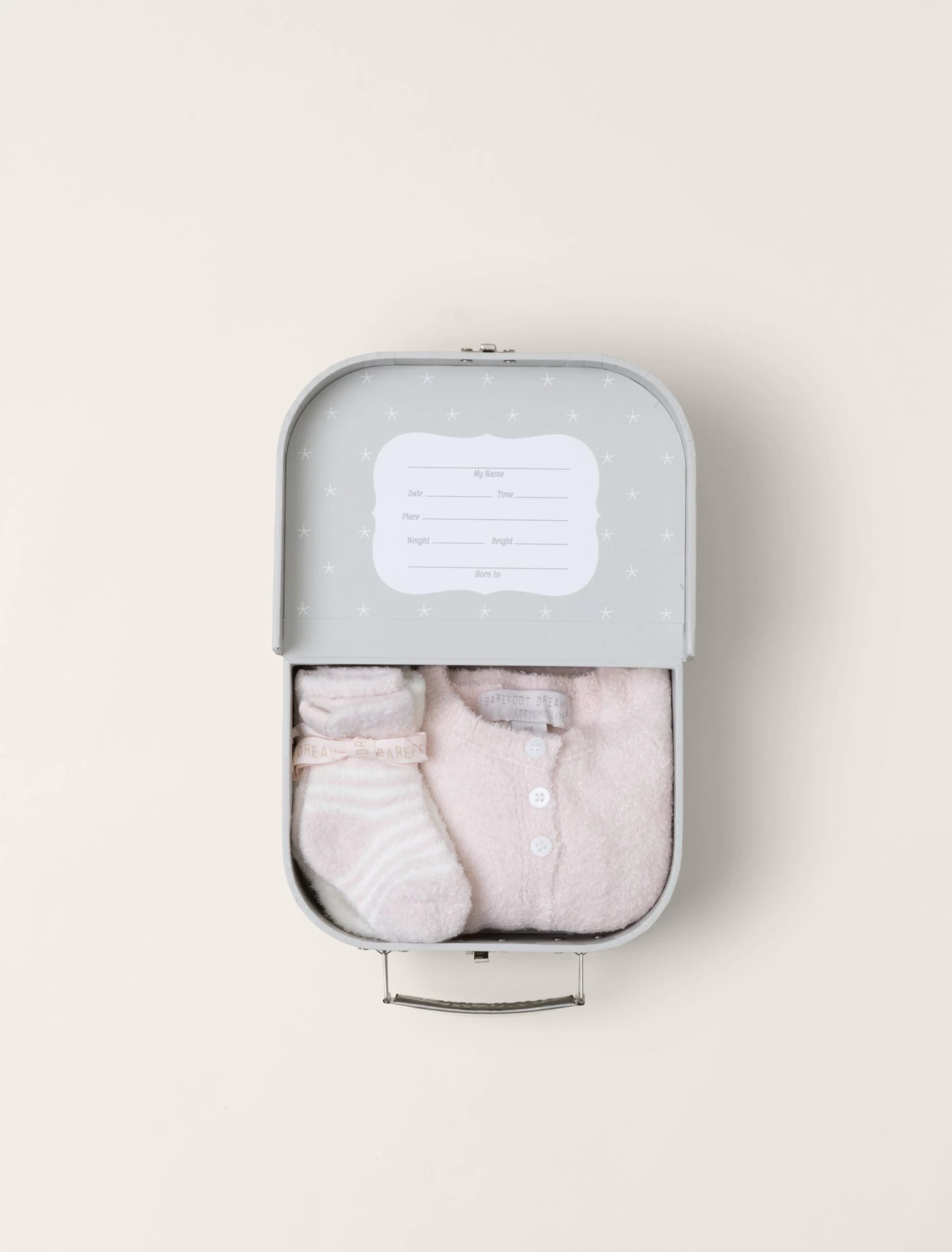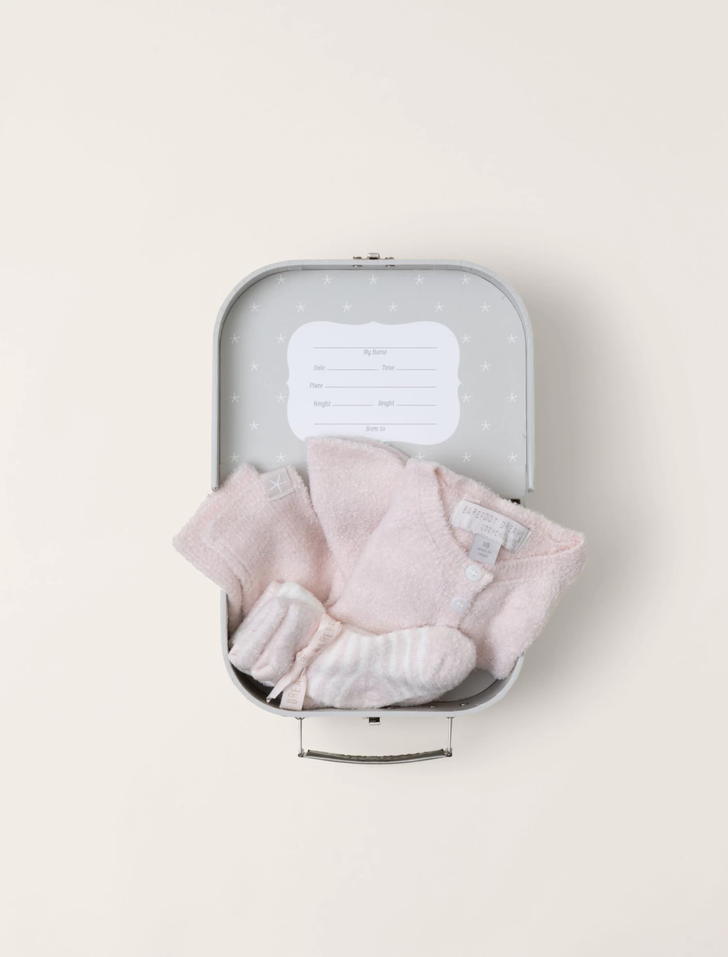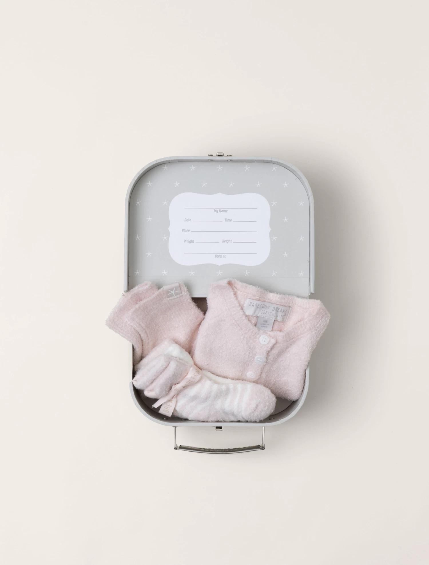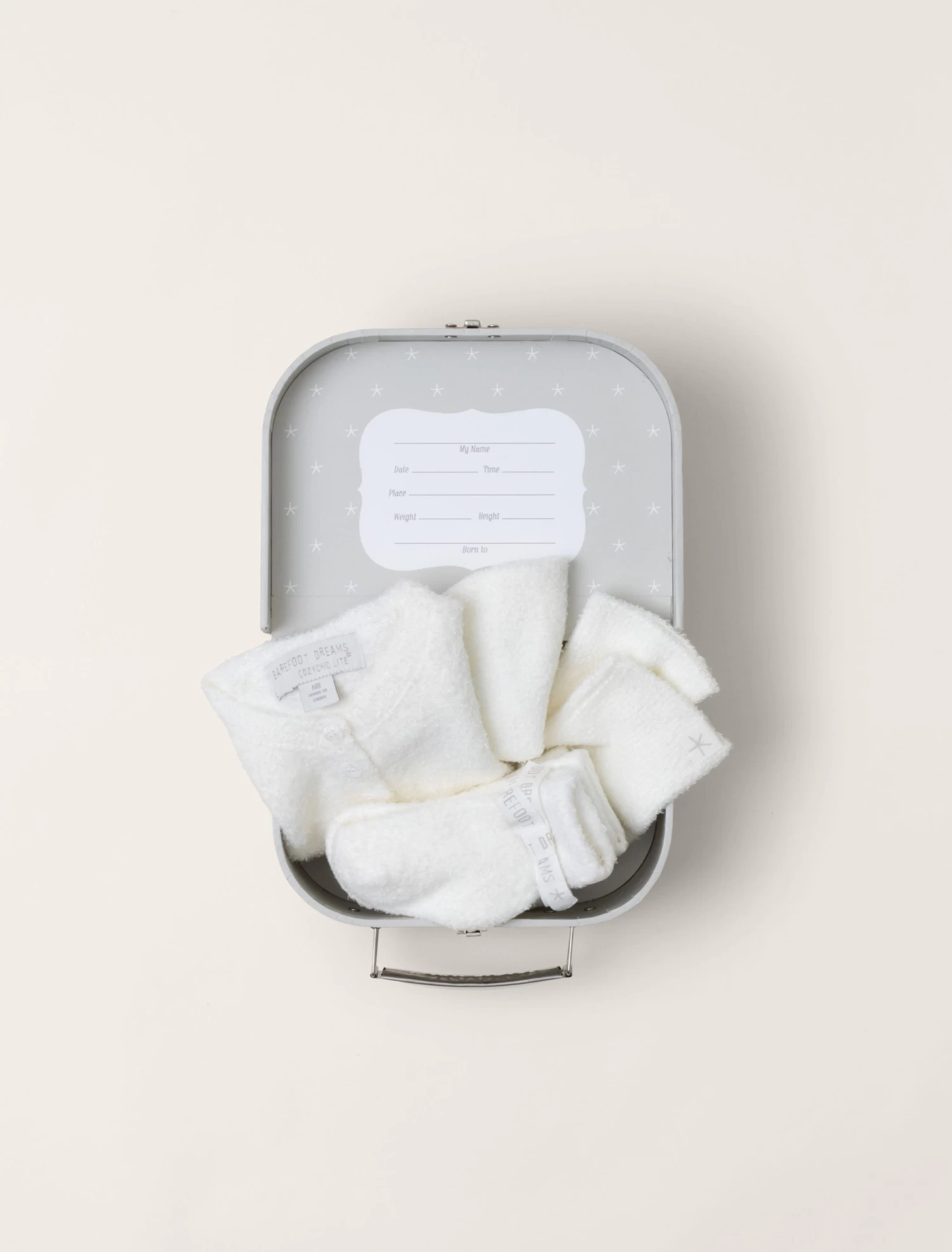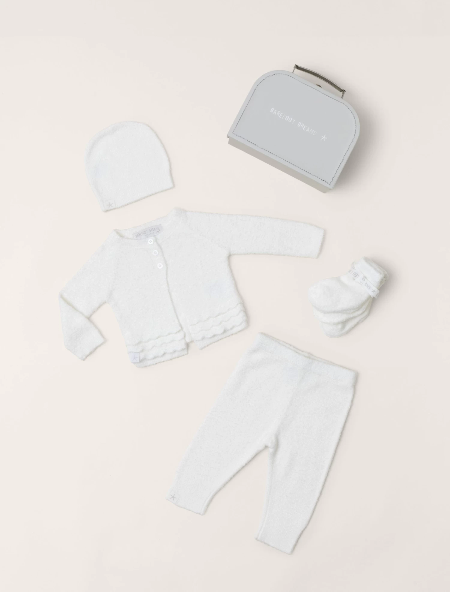 Coming home from the hospital just got sweeter with our Heirloom Newborn Set. This is every newborn’s must have when it comes to being enveloped in super soft, luxurious coziness for their first trip home. Each suitcase ensemble includes a CozyChic Lite cardigan, pull on pant, beanie and three pairs of socks.The suitcase doubles as the perfect keepsake box that details important info; Name, Date, Time, Place, Height, Weight and Born to.