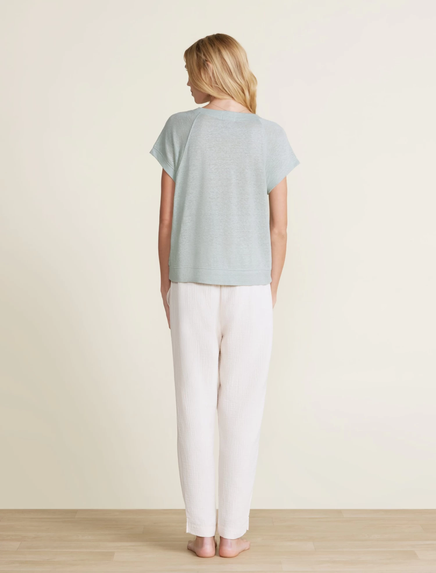 From our Barefoot Dreams Malibu Collection®, the Linen Raglan Tee features a semi-relaxed fit short sleeve with rib neck, sleeves, and waistband for a comfortable yet stylish look. Perfect for any occasion, the carefully crafted design ensures you look and feel your best. Model is 5’11” and wearing a size Small.